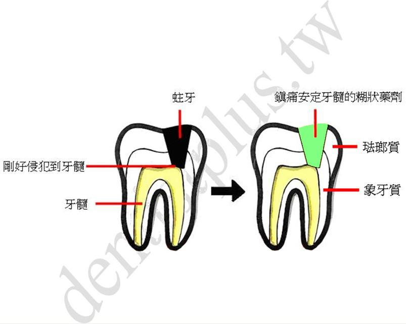 此時會先去除蛀牙的部分,然後放鎮痛安定神經糊狀藥劑,之後觀察一個月。