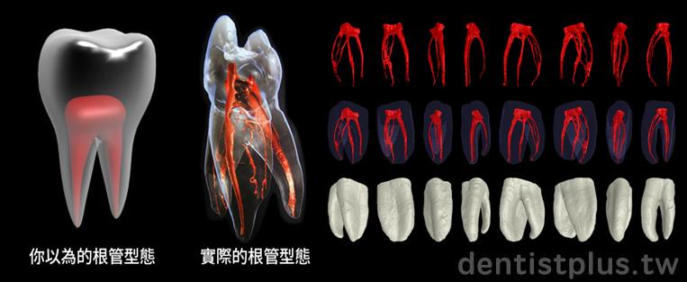根管治療的難度在於牙髓神經的錯綜複雜(如中及右圖),不是想像的這樣(如左圖)。